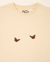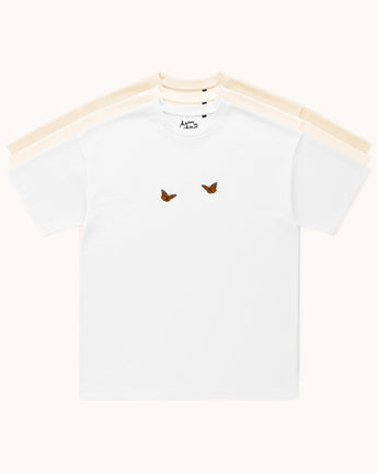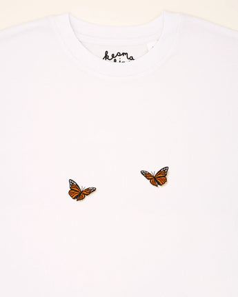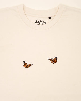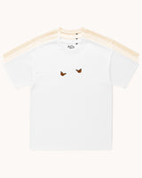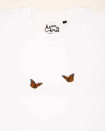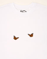 Zwei süße Schmetterlinge auf diesem T-Shirt verströmen Leichtigkeit und Anmut. Mit zarten Linien und einer verspielten Anordnung fängt das Motiv die Schönheit des Flügelschlags ein – ein Symbol für Vergänglichkeit und das Streben nach Harmonie.