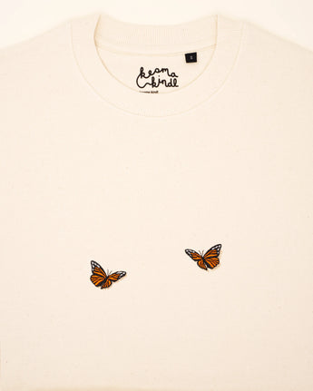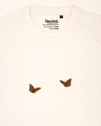Zwei Schmetterlinge, direkt auf der Brust gestickt. Klare Form, ruhige Platzierung. Ein schlichtes Motiv mit dezenter Präsenz – tragbar das ganze Jahr über.