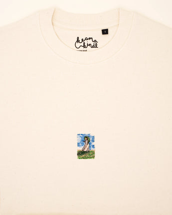 Ein Hauch von Kunstgeschichte zum Anziehen: Das zentrierte Stickmotiv zeigt ein Miniatur-Gemälde im Stil von Claude Monet – detailreich, farbenfroh und subtil zugleich. Für alle, die Kunst lieben und sie mit Leichtigkeit tragen wollen.