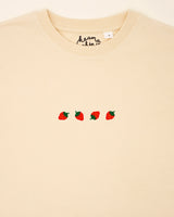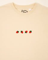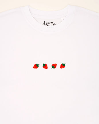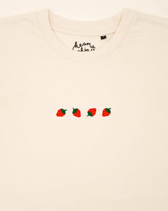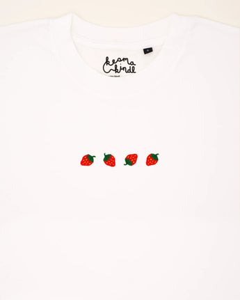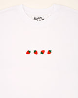 Four small, red strawberries – embroidered delicately on this T-shirt. Each one shines in its own way: the vibrant colors, the soft shapes, instantly reminding us of summer. It’s the perfect design for those who enjoy sweetness but still crave something special. The strawberries evoke the freshness of summer and the joy found in life’s little things. A subtle yet powerful expression of joy and nature.