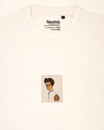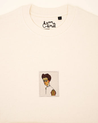 „Selbstporträt“ von Egon Schiele – Ausdruck, Zerbrechlichkeit und rohe Emotion, dezent auf deinem Pullover verewigt. Markante Linien und eindringlicher Blick für alle, die Kunst nicht nur verstehen, sondern fühlen wollen.